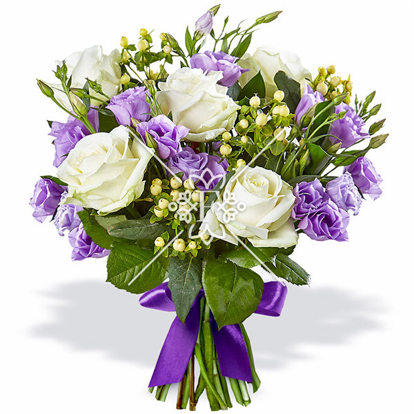 Беспроигрышное сочетание роз и эустом, в контексте бело-сиреневой гаммы, не сможет оставить никого равнодушным к данному букету. Но не стоит забывать и про интересный акцент в виде ягод гиперикума, которые считаются символом вдохновения и радости.